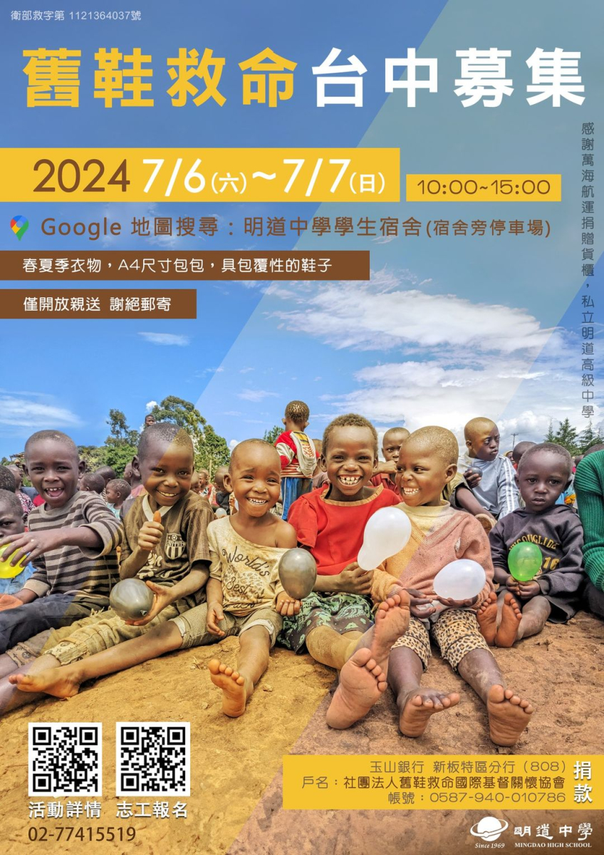 社團法人舊鞋救命國際基督關懷協會於113年7月6日至7日,在台中市明道高級中學辦理「2024舊鞋救命二手物資台中募集」活動,鼓勵貴校師生及家長踴躍捐贈物資及報名擔任志工